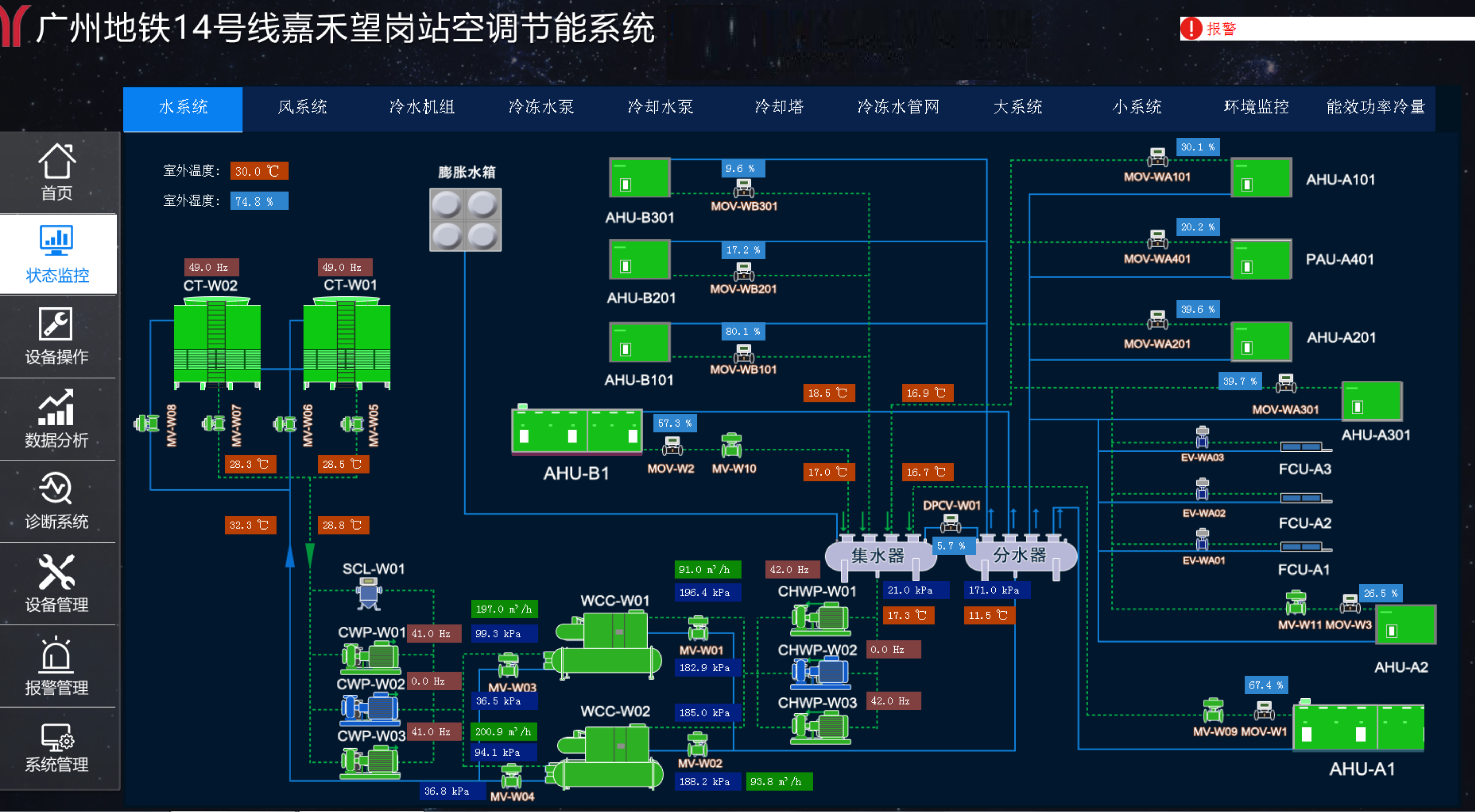 系統設計階段:在設計院的基礎上,深化圖紙設計,優化管路,將冷凍水泵的總揚程減低8米; 設備選型階段:選擇一級能效的冷凍機和水泵,并確保各個機組的高效點匹配; 優化運行階段:采用智能控制技術,確保在不同負荷下系統的運行COP值達到最優; 全生命周期管理:提供了全方位的系統、設備、傳感器的故障預警、故障診斷和分析工具以及運維管理系統,幫助用戶實現系統全生命周期管理。 ? 經過合肥通用所檢測,嘉禾望崗站冷凍站系統投運后的一整年,冷凍站的平均運行能效達到5.8,超過一級能效5.5的指標。
